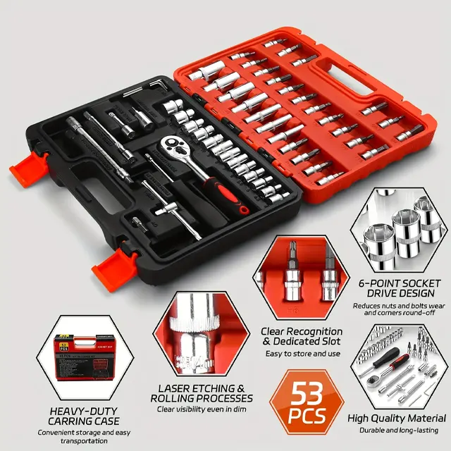 ৫৩ পিসির ব্যাপক সরঞ্জাম সেট: ১/৪-ইঞ্চি ড্রাইভ সকেট র্যাচেট রেঞ্চ সেট আপনার মোটরগাড়ি রক্ষণাবেক্ষণের কাজে সম্পূর্ণরূপে আপনার চাহিদা পূরণ করতে পারে। সকেট র্যাচেট রেঞ্চ সেটটি পেশাদার এবং অর্থনৈতিকভাবে ডিজাইন করা হয়েছে যাতে আপনি চিন্তা, অর্থ এবং শ্রম সাশ্রয় করতে পারেন।